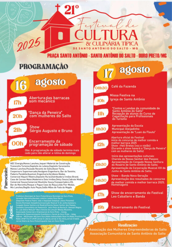 O distrito ouro-pretano de Santo Antônio do Salto reúne visitantes e comunidade neste fim de semana para a 21ª edição do Festival de Cultura e Culinária Típica, evento tradicional do calendário cultural da cidade.