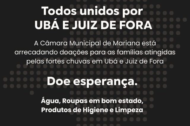 A Câmara Municipal de Mariana iniciou uma campanha de arrecadação de donativos em apoio às famílias atingidas pelas fortes chuvas nos municípios de Ubá e Juiz de Fora. As precipitações recentes deixaram marcas profundas nas duas cidades, provocando perdas materiais e impactando significativamente a vida de centenas de famílias.
