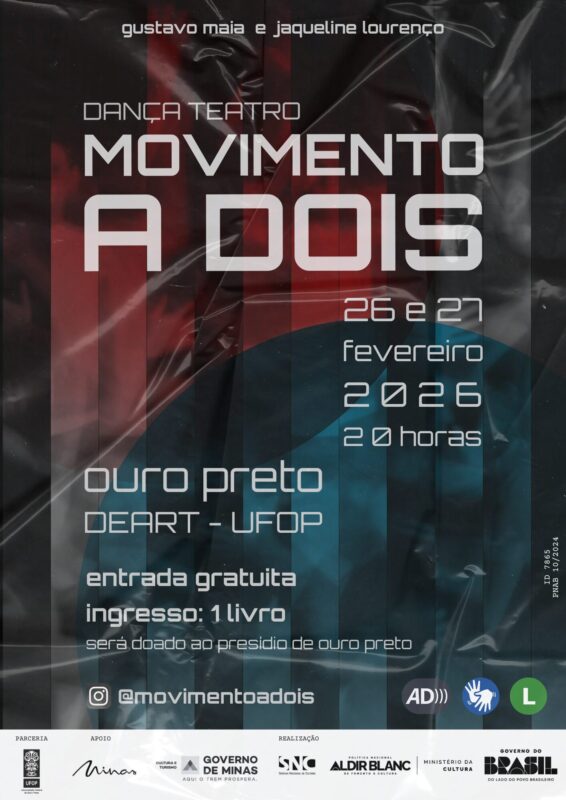 A cidade de Ouro Preto será o palco das próximas apresentações do “Movimento a Dois”, um espetáculo que une a dança e o teatro e reafirma que a arte só é completa quando é para todos. O público poderá assistir a peça nos dias 26 e 27 de fevereiro, às 20h, Sala Preta do DEART da UFOP, localizado no Campus Morro do Cruzeiro, em Ouro Preto. A entrada é solidária, mediante a doação de um livro em bom estado que será destinado ao presídio do município.