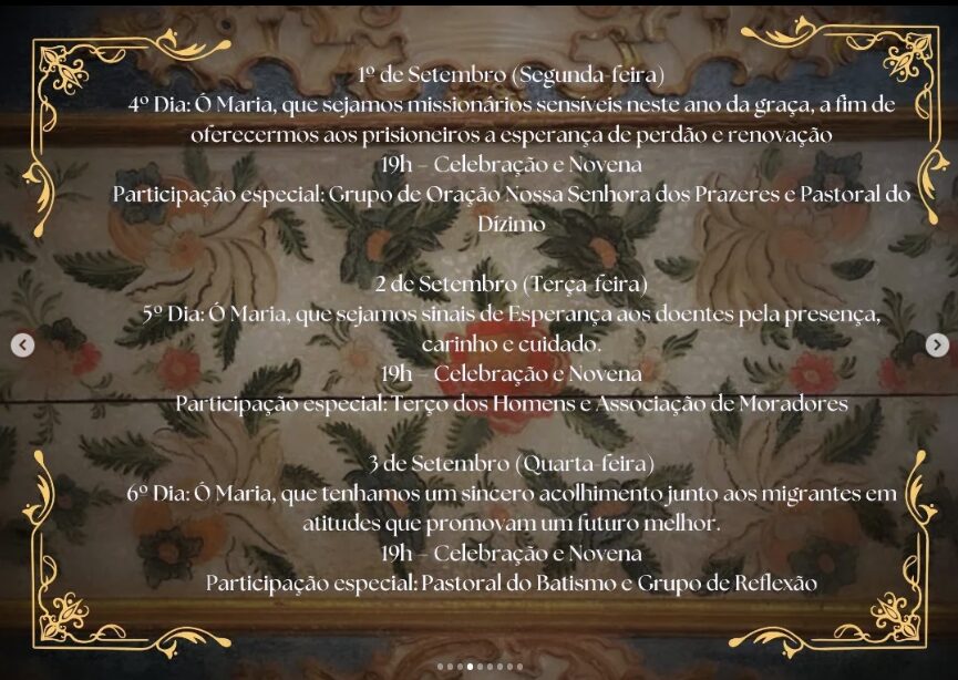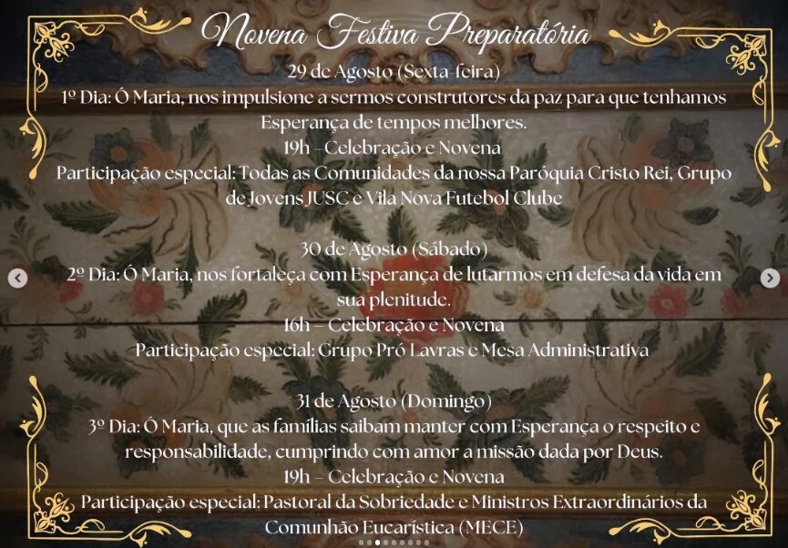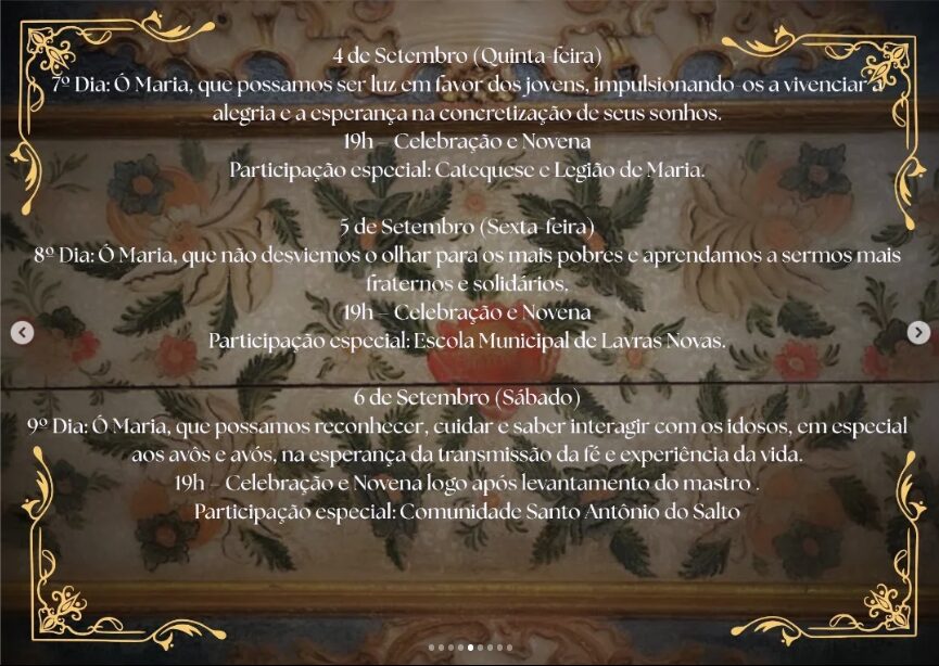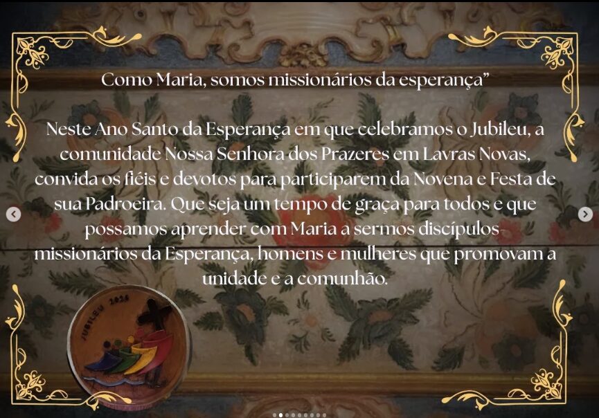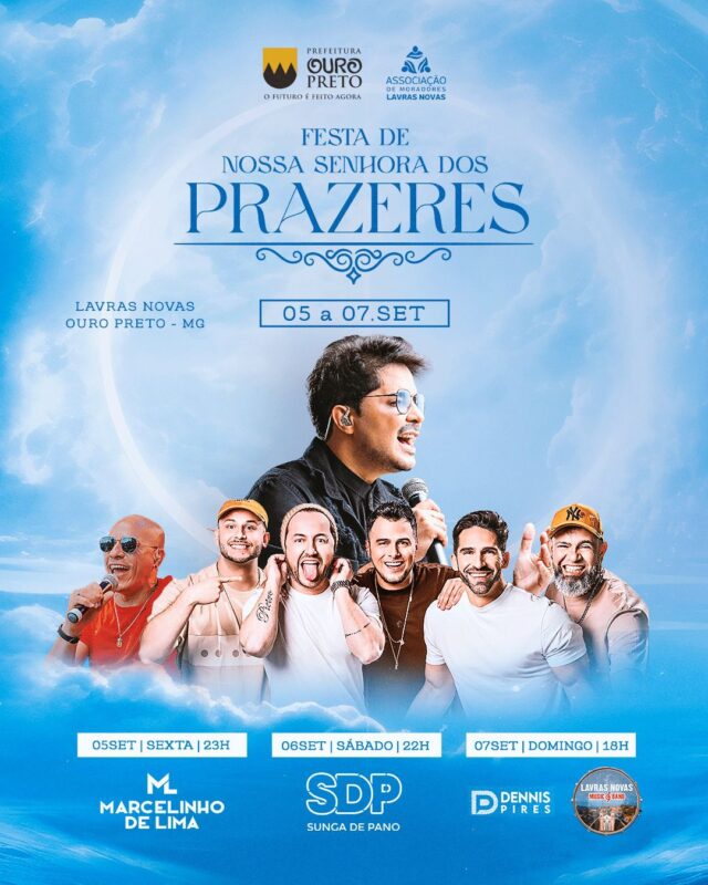 A Festa de Nossa Senhora dos Prazeres é um momento de fé, tradição e devoção que reúne a comunidade em oração, música e celebração. Este ano será realizada de 05/09/2025 à 07/09/2025 no distrito de Lavras Novas. Uma oportunidade para renovar a espiritualidade e fortalecer os laços culturais que marcam nossa história. A festa é composta de programação religiosa e cultural.
