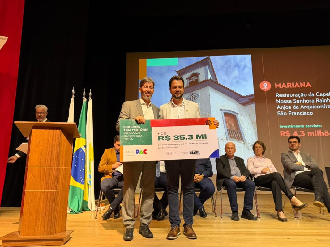 Congonhas – O presidente do Instituto do Patrimônio Artístico e nacional (IPHAN), Leandro Grass, entregou na quarta-feira, 10/12, cheques para os prefeitos dos municípios contemplados no Programa de Aceleração do Crescimento (PAC), do Governo Federal. Ouro Preto receberá R$ 41,8 milhões e Mariana R$ 35,3 milhões a serem investidos em obras de restauro.