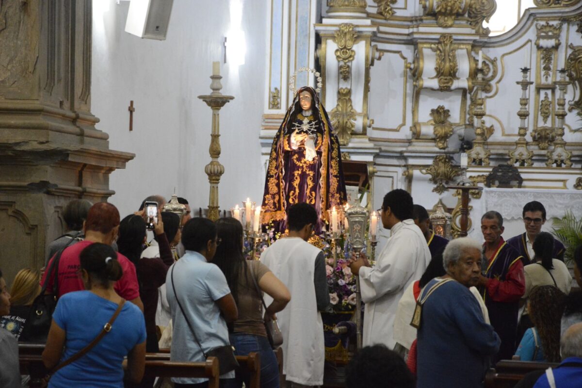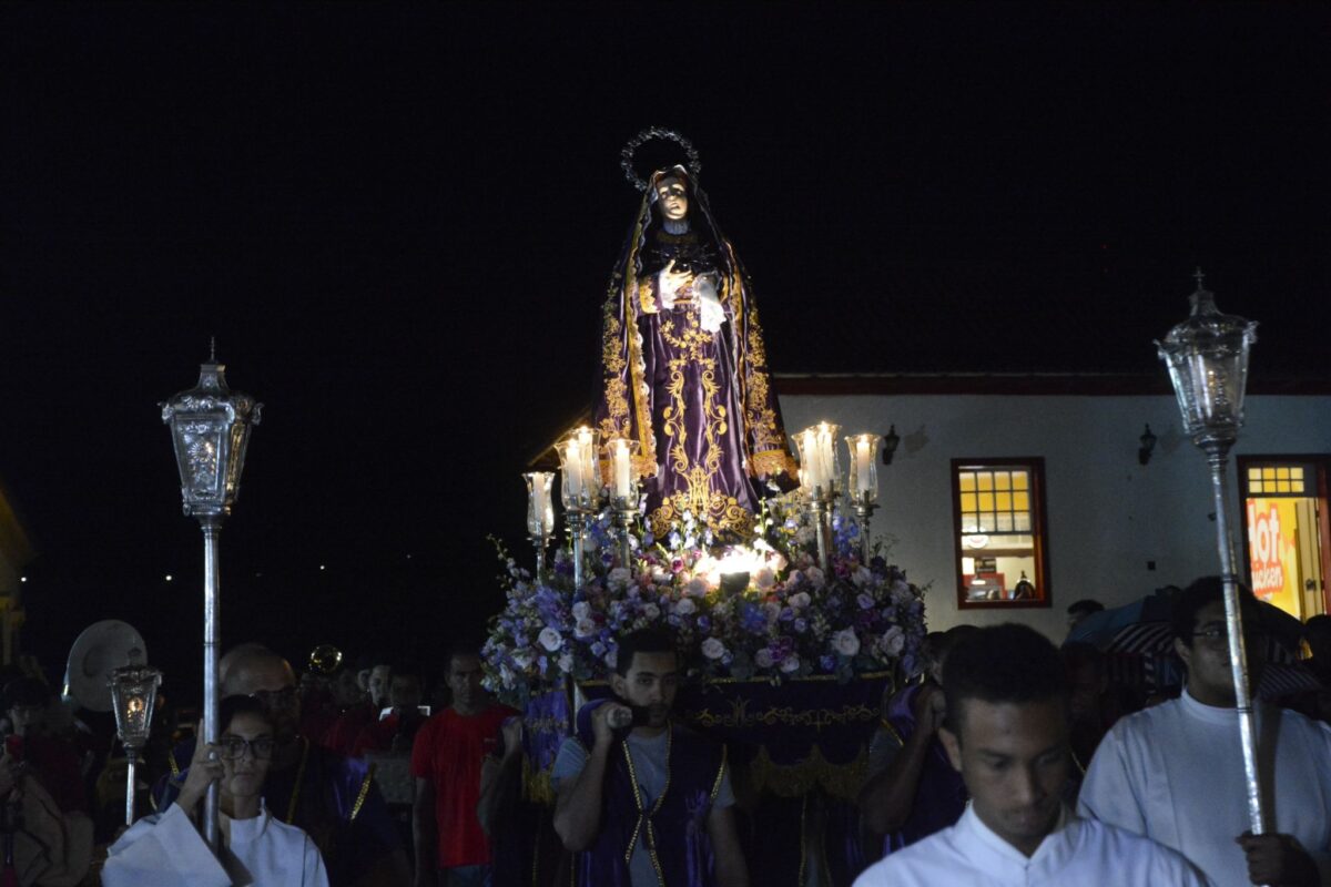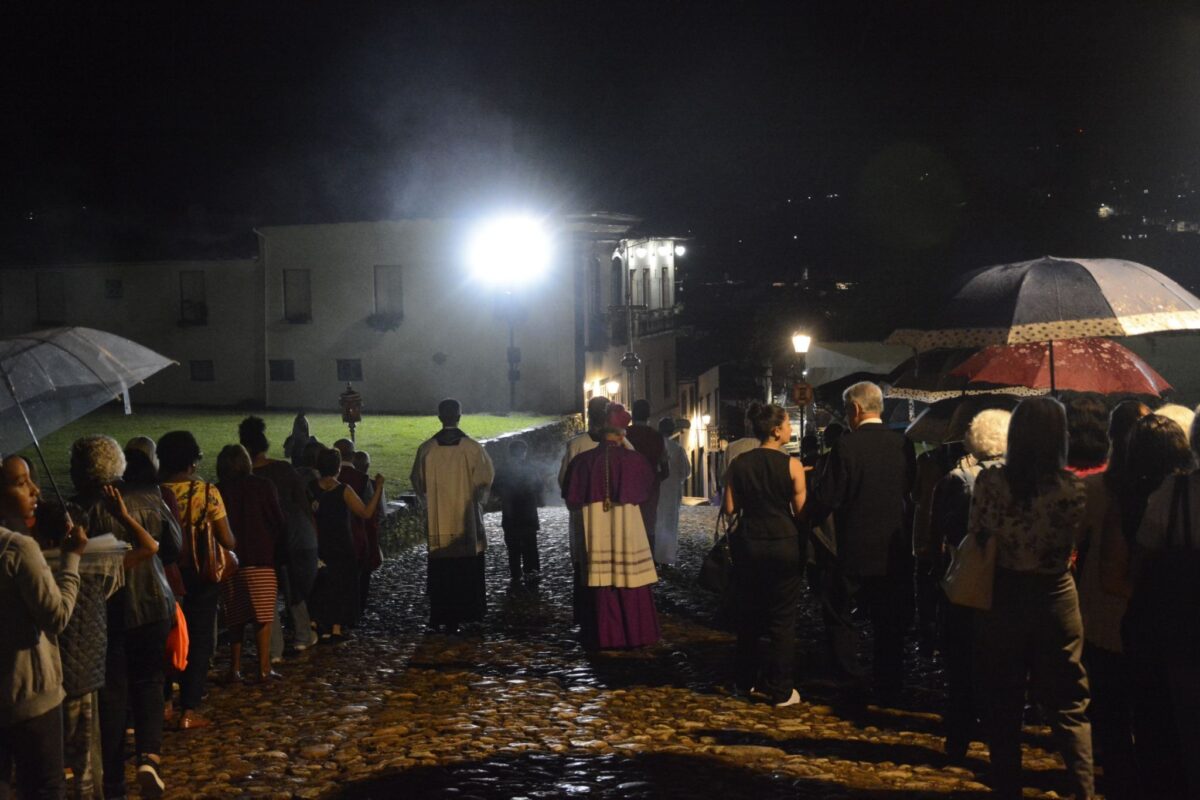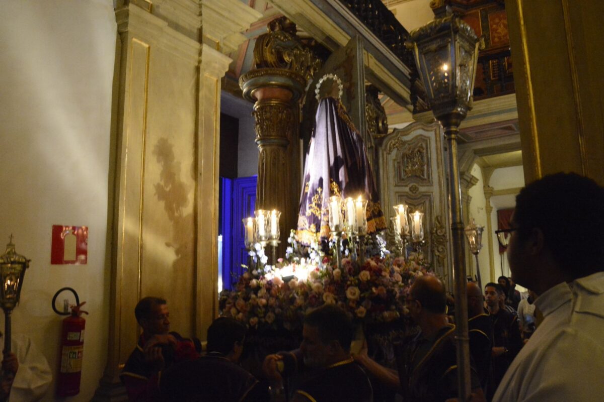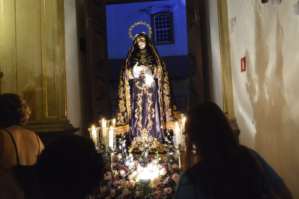 Ontem, quarta-feira (02), fiéis marianenses realizaram o tradicional Ofício de Trevas na Catedral Basílica de Nossa Senhora da Assunção. Antes da cerimônia, foi realizada a Santa Missa na Igreja de Nossa Senhora do Carmo e uma procissão, que levou a imagem de Nossa Senhora das Dores até a Catedral da Sé de Mariana, atravessando o coração do centro histórico marianense. O percurso contou com cânticos de centenas de fiéis, acompanhados pelo cortejo da Sociedade Musical Dezesseis de Julho, que performou melodias sacras de forma sublime junto aos fiéis.