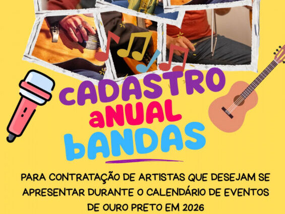 Estão abertas as inscrições para o credenciamento de artistas que desejam se apresentar durante o calendário de eventos de Ouro Preto em 2026. O credenciamento é destinado a artistas solo, bandas e grupos musicais interessados em se apresentar nos eventos da cidade. A iniciativa tem como objetivo fortalecer a produção artística local, ampliar a diversidade cultural e fomentar a economia criativa da cidade.