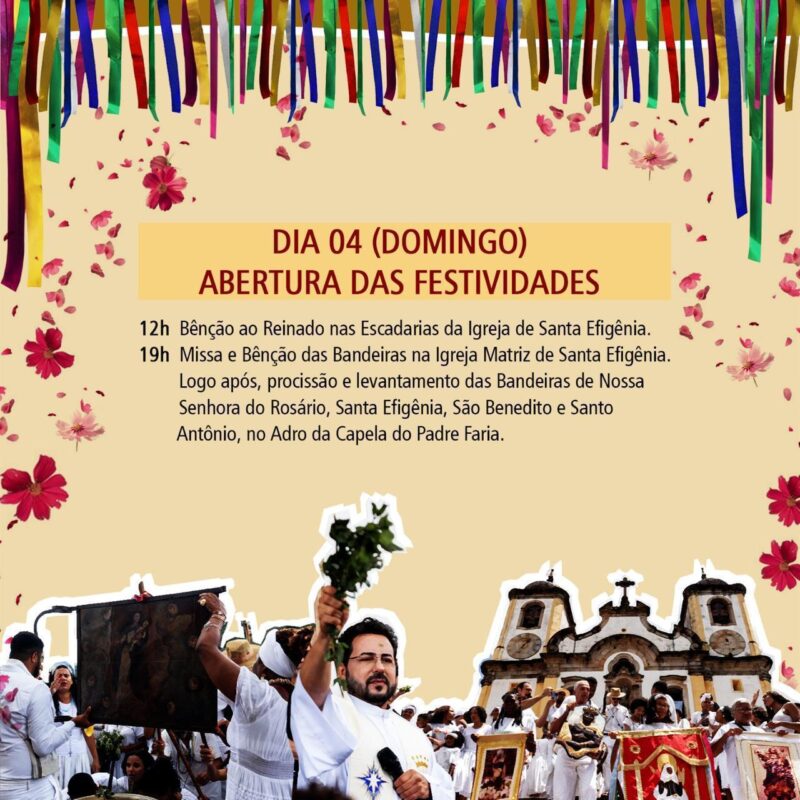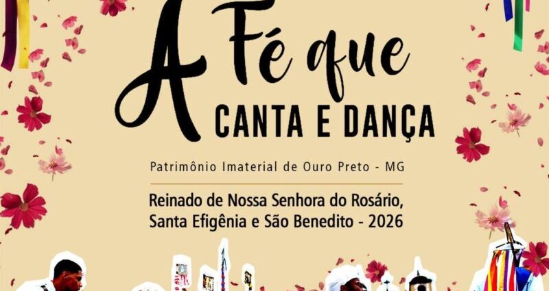 Entre os dias 04 e 11 de Janeiro de 2026 Ouro Preto recebe mais uma edição de “A Fé que Canta e Dança,” Reinado de Nossa Senhora do Rosário, Santa Efigênia e São Benedito. A programação conta com oficinas, lançamento de livros e Missas além de cortejos, confira a programação completa: