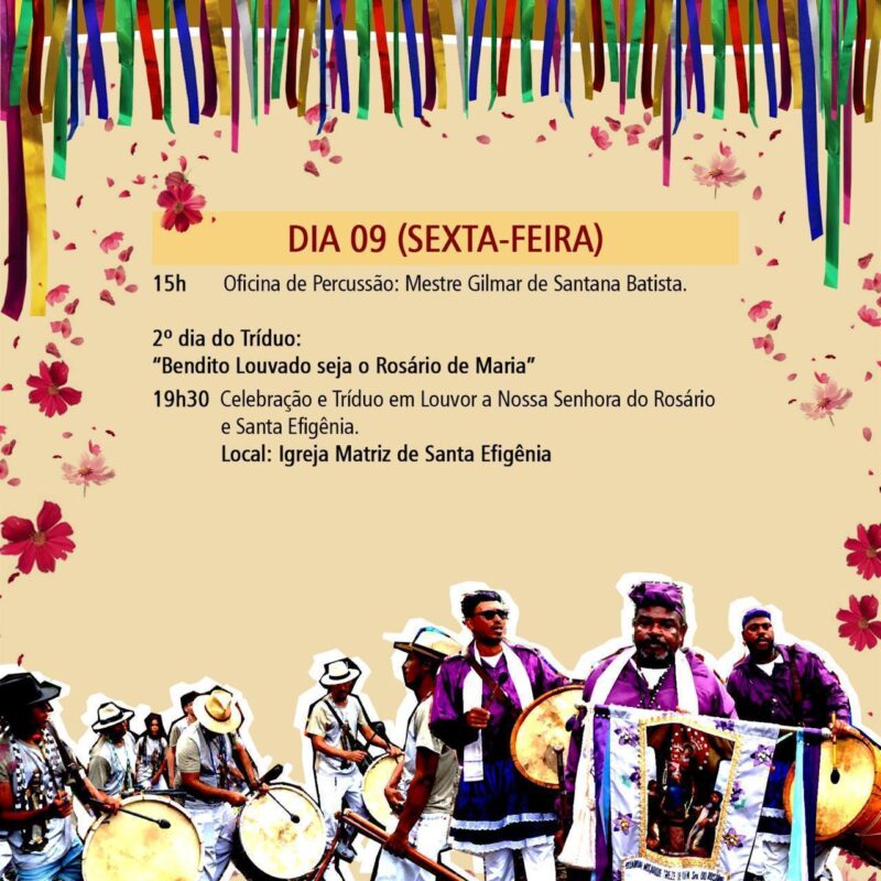 19h30 – Missa e encerramento do Tríduo em Louvor a Nossa Senhora do Rosário e Santa Efigênia.