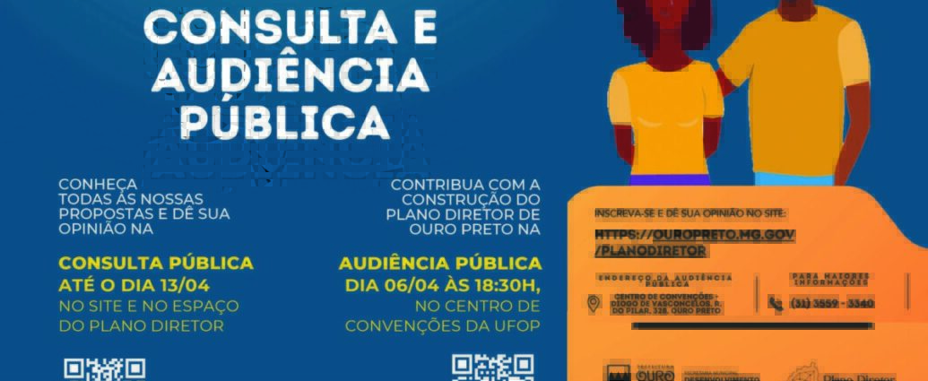 A Prefeitura Municipal de Ouro Preto, por meio da Secretaria de Desenvolvimento Urbano e Habitação, convida você a participar da Audiência Pública de Proposição da Revisão do Plano Diretor e da Legislação Complementar.