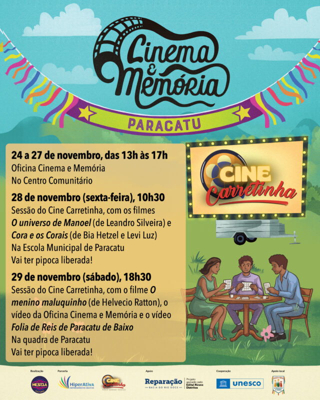 O projeto Cinema e Memória é uma realização da Mezcla Cultural, com parceria da Hiperativa Empreendimentos Criativos, apoio da Reparação da Bacia do Rio Doce e cooperação da Unesco. Todas as sessões de cinema são abertas ao público e contam com pipoca liberada para os participantes.