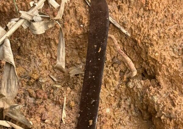 Durante o atendimento da ocorrência, em buscas no quintal da casa vizinha, arma do crime, um facão foi encontrado e apreendido