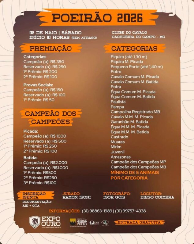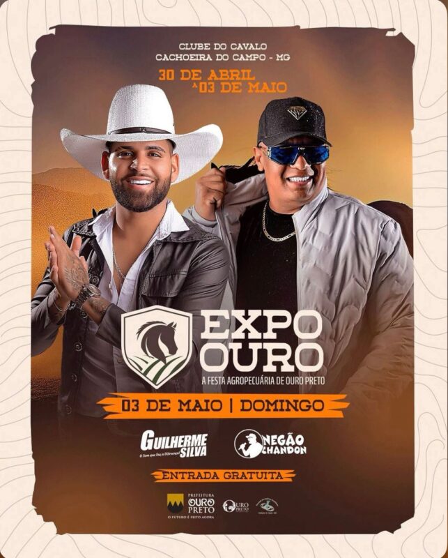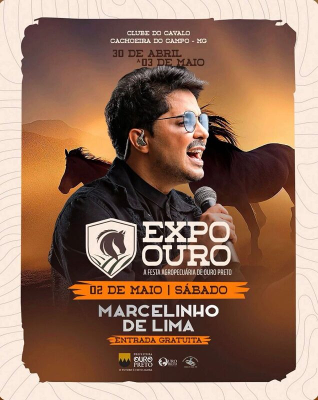 A partir desta quinta-feira (30), o distrito de Cachoeira do Campo, em Ouro Preto, recebe a edição 2026 do ExpoOuro. A programação segue até domingo (3), no Clube do Cavalo de Cachoeira do Campo, reunindo shows musicais, atividades tradicionais do meio rural e competições, com entrada gratuita todos os dias.