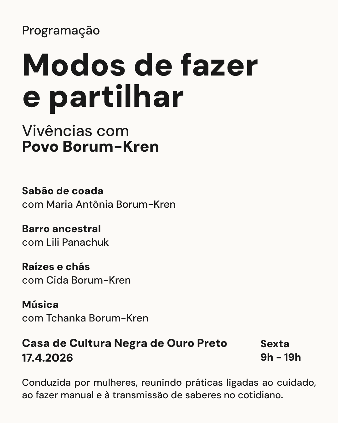No dia 17 de abril, das 9h às 18h, o projeto realiza a vivência Modos de fazer e partilhar, aberta ao público em Ouro Preto, com oficinas conduzidas por mulheres do povo Borum-Kren. O IA – Instituto de Arte Contemporânea de Ouro Preto lança o programa Poética dos Territórios, iniciativa voltada à pesquisa e à cartografia simbólica de práticas culturais na região de Ouro Preto e Mariana. A primeira edição, Cosmologias e Saberes Borum-Kren, é realizada em parceria com o povo Borum-Kren e acompanha processos contemporâneos de ressurgência cultural, transmissão de saberes e relação com o território na região do Rio das Velhas.