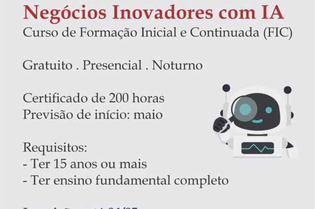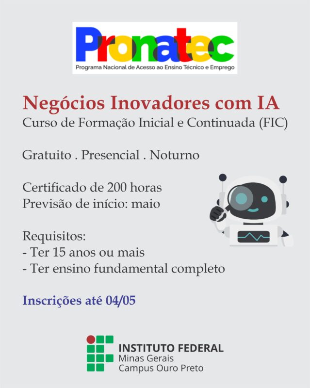 O IFMG Campus Ouro Preto está com inscrições abertas para o curso gratuito de Formação Inicial e Continuada (FIC) “Negócios Inovadores com IA”, ofertado por meio do PRONATEC Empreender – Bolsa-Formação. A iniciativa tem como objetivo qualificar estudantes para atuar no campo do empreendedorismo, com foco no uso estratégico da inteligência artificial na criação e desenvolvimento de negócios inovadores.